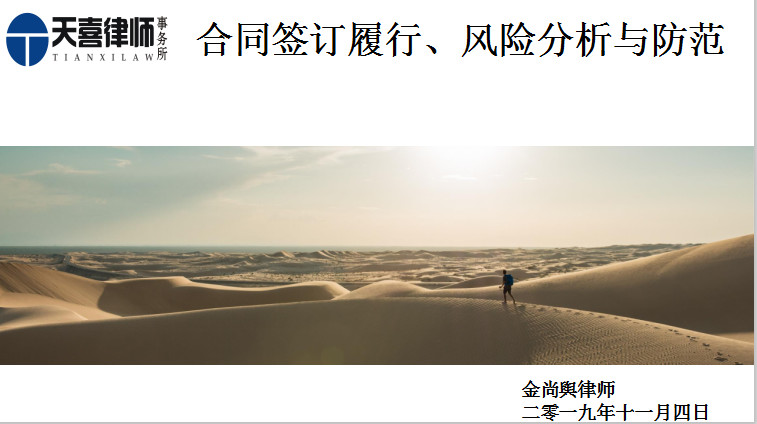 2019年11月1日,本所金尚舆律师受邀为客户单位重庆市交通工程监理咨询有限责任公司提供了一场主题为“合同签订履行、风险分析与防范”的法律讲座,公司主要高级管理人员及员工参加了本次培训。本讲座主要针对交通监理工程企业的实际需要,旨在为客户树立良好的交通监理合同签订、履行等合同流程思路,提高客户的交通监理业务风险预判能力。